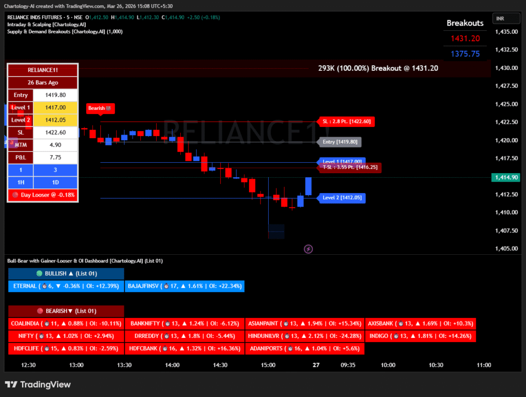 The strategy works on TradingView charts. You can execute trades manually using your preferred broker. This gives you full control over trade execution and risk management.